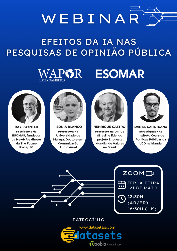 🎙️ Únete a los destacados especialistas Ray Poynter (ESOMAR/The Future Place), Henrique Castro (World Values Survey, Brasil), Daniel Capistrano (World Values Survey, Brasil) y Sonia Blanco (Universidad de Málaga) quienes debatirán sobre cómo los algoritmos y datos sintéticos afectan nuestra idea y práctica de investigaciones sobre opinión pública y comportamiento social. Este nuevo webinar de WAPOR Latinoamérica está agendado para el 21 de mayo y es abierto a todos.