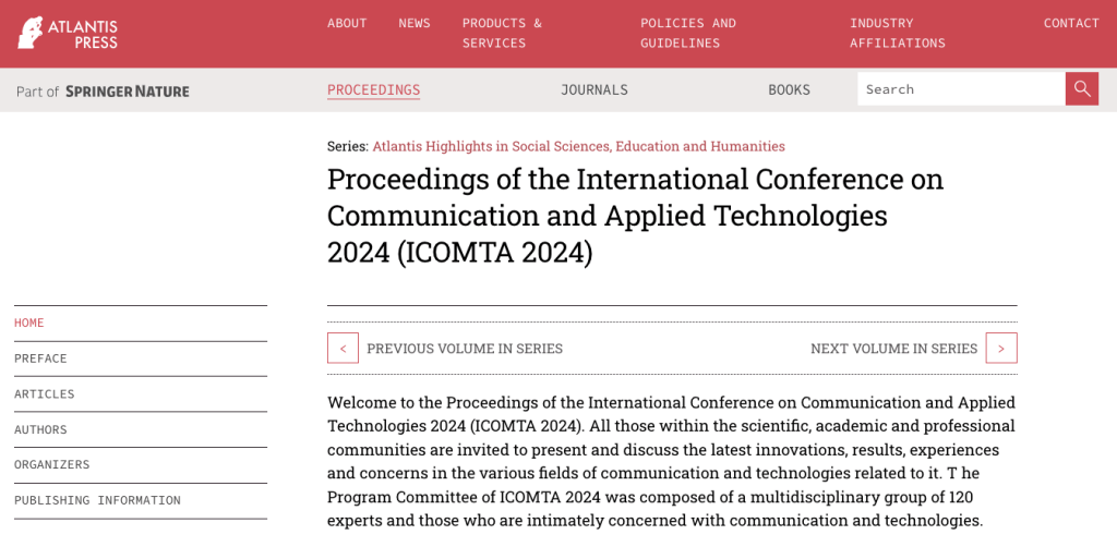 - La prestigiosa editorial de acceso abierto, Atlantis Press, ha publicado el libro de actas de la Conferencia Internacional en Comunicación y Tecnologías Aplicadas de 2024 (ICOMTA’24), celebrada del 4 al 6 de septiembre en Lima, Perú